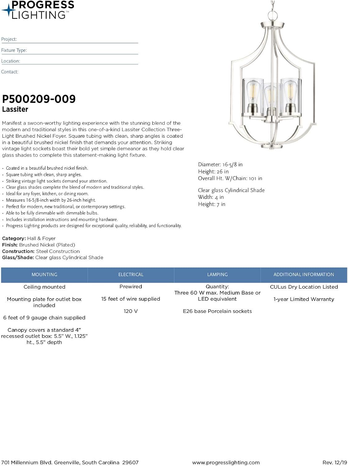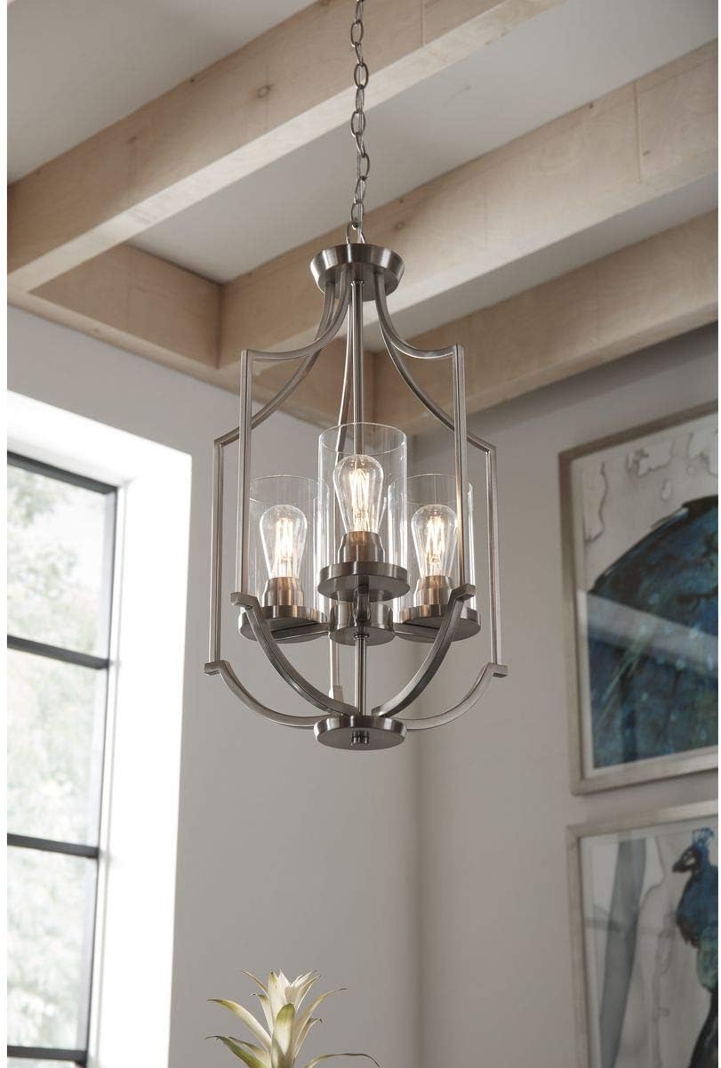 Manifest a swoon-worthy lighting experience with the stunning blend of the modern and traditional styles in this one-of-a-kind Lassiter Collection Three-Light Brushed Nickel Foyer. Square tubing with clean, sharp angles is coated in a beautiful brushed nickel finish that demands your attention. Striking vintage light sockets boast their bold yet simple demeanor as they hold clear glass shades to complete this statement-making light fixture.