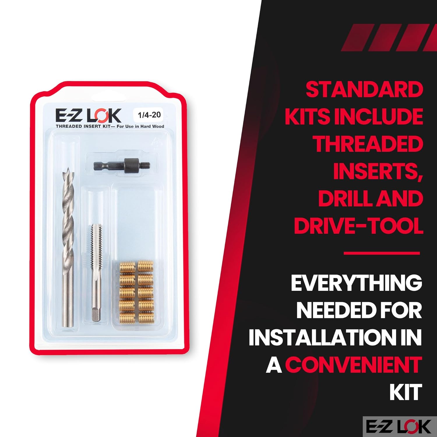E-Z LOK Threaded Insert Installation Kit for Hard Wood - BrassThe E-Z LOK thread repair kit provides you with the ultimate solution for creating strong threaded holes in hard wood. The kits feature stainless steel or brass thread inserts, a drill, a tap and drive tool for a seamless repair process.This thread insert kit is ideal for cabinetry, furniture, partitions, display cases, beer tap handles, shipping containers, or anywhere a fastener will be used in wood. This all-in-one kit is your answer to revitalizing threads effortlessly and offers a user-friendly and effortless installation experience. Say goodbye to the struggles of worn-out threads.Installation:To install the inserts, simply drill a hole with the include drill, tap the hole with the included tap, and then thread in the insert using the included drive tool. Adding a little wax or oil to the insert before installation can help reduce resistance.