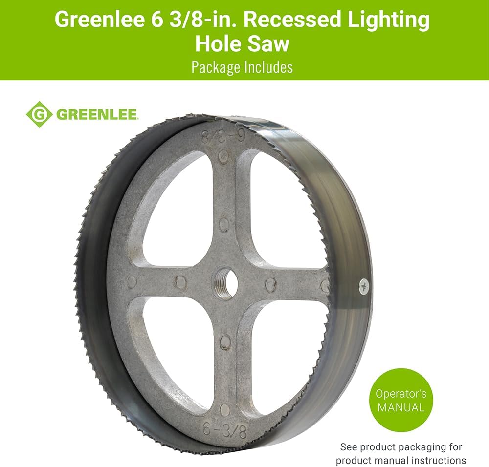 Product Description Master your jobs with speed and accuracy with the Greenlee 6-3/8" Recessed Lighting Hole Saw (catalog number 35713). Designed for electrical experts, this hole cutting saw makes it easy to create recessed lighting fixtures in a variety of material including plywood, wood, acoustical tile, ceiling tile, and drywall. It effortlessly cuts large and precise 6-3/8" holes on even the toughest materials with a maximum thickness of 7/8". Greenlee's Recessed Lighting Hole Saw is the industry's only interchangeable replacement blade with a 7/16" harbor shank. The Eazy Connect system provides simplified connectivity to your power drill so you can create recessed lighting fixtures in no time. Constructed with a heavy-duty steel tooth blade and strong durable back plate, this recessed lighting saw withstands years of rugged use on the jobsite. Greenlee: Professional. Nothing Less.™ From the Manufacturer Industry's only interchangeable replacement blades. Strong durable back plate. Available in two styles, steel tooth and carbide grit. Made and designed in USA by Greenlee. Use with a power drill to cut large diameter holes for recessed lighting fixtures. Saws use Greenlee arbor 37156, purchased separately. Steel toothed blade can be used on up to 7/8-Inch (22.2 mm) plywood, wood, acoustical tile and ceiling tile.